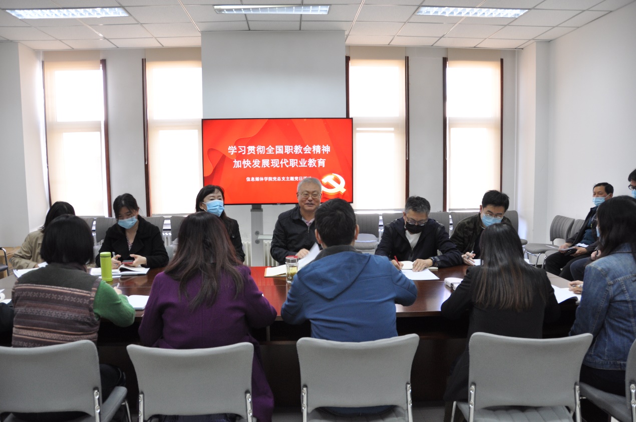 为扎实推进党史学习教育,深入学习习近平总书记对职业教育工作作出的重要指示,信息媒体学院党总支于2021年4月14日开展了以“学习贯彻全国职教会精神 加快发展现代职业教育”为主题的党日活动。此次会议由信息媒体学院党总支书记彭焱主持,信息媒体学院全体教职工参加了此次会议,校党委书记孙善学同志做了职教会议精神专题辅导。